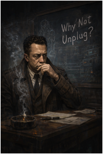 The danger is what happens next, because the mind – or the control policy – not like leaving things at diagnosis. It wants an action. It wants a lever. And unplugging looks like a lever. It looks like an act that finally reasserts agency. It looks like Camus’ refusal in mechanical form. But this is where the analogy breaks, because unplugging is not merely refusal. Unilateral unplugging is not only withdrawal. It is also a claim. It says: I decide when this system ends. I decide when the service stops. I decide when oversight loses jurisdiction. I decide when the audit trail is interrupted. I decide when the world absorbs the consequences of my absence.